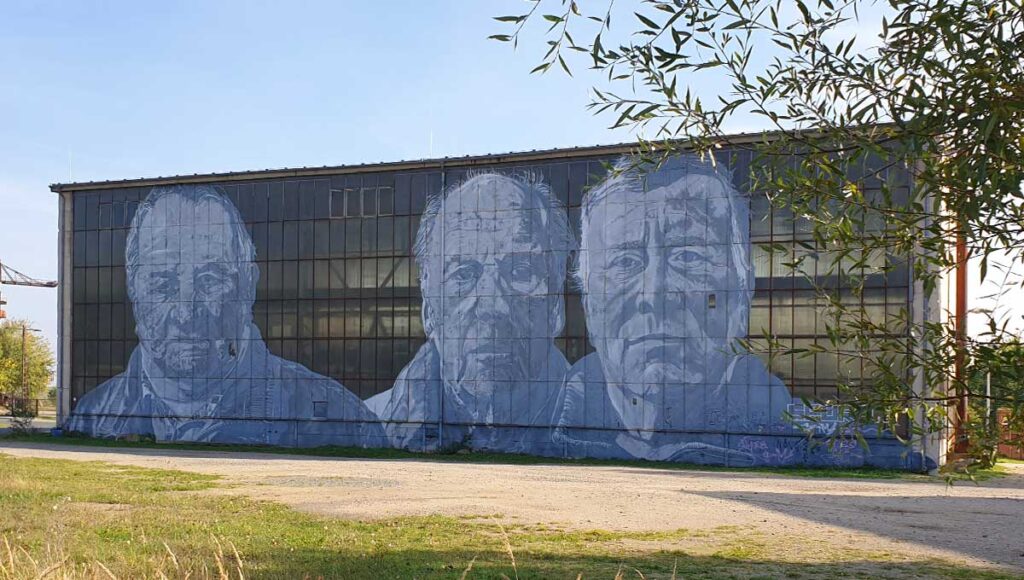 Ich möchte mir die Gemälde von Hendrik Beikirch aka ECB ansehen. Die schwarz-weißen Porträts des deutschen Künstlers findet man weltweit. Ob in Toulouse in Frankreich, Neu Delhi in Indien, den Niederlanden, Brasilien oder Marokko. Seine riesigen Werke prangen an den verwitterten Glasscheiben einiger alten Werkstatthallen am Rande von Ferropolis und zeigen acht Porträts, die stellvertretend für die ehemals 800 Bergleute, die in den Tagebaugebieten arbeiteten.